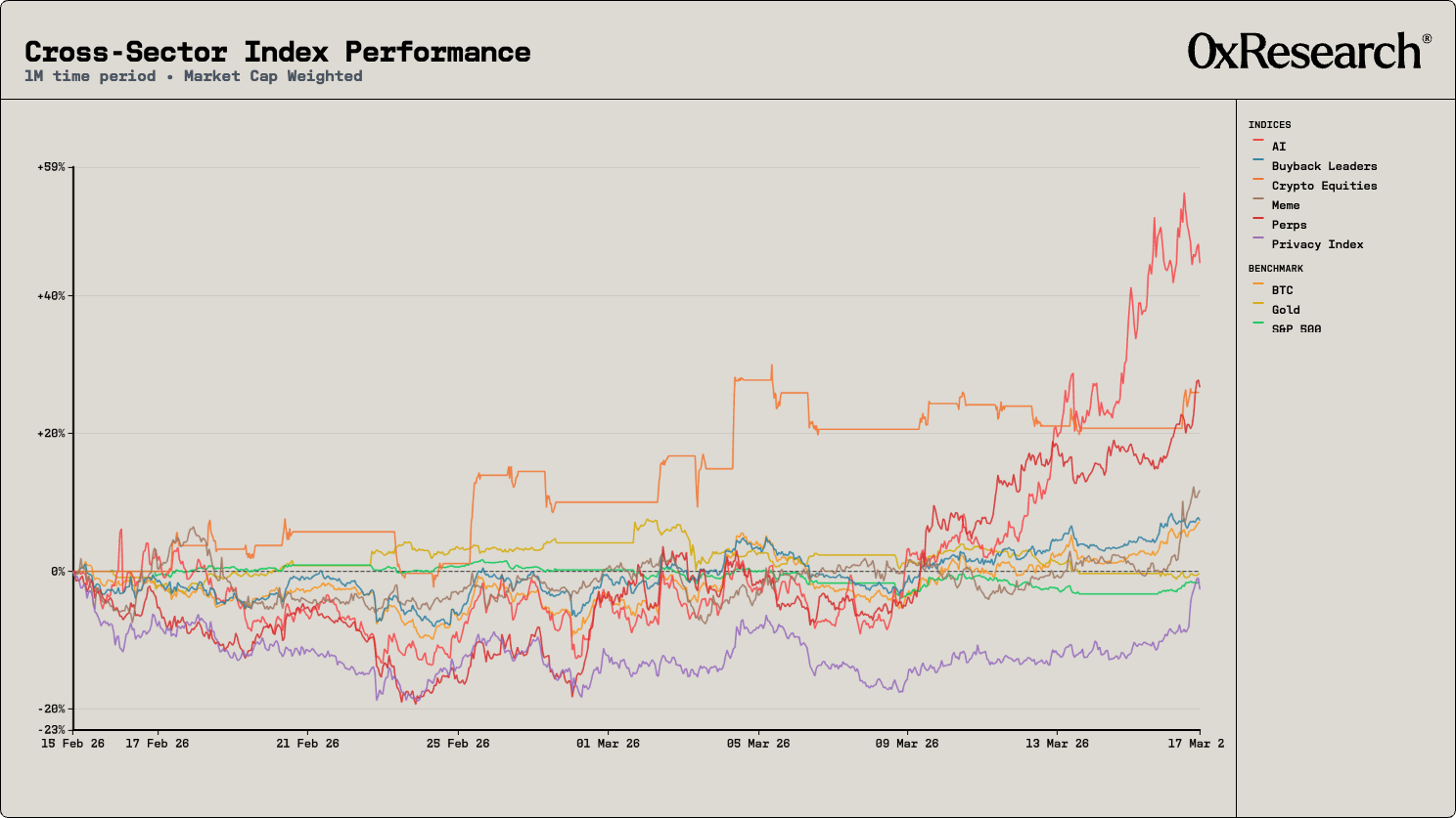 BTC closed March 16 up 2.6%, ahead of QQQ at 1.6%, SPY at 1.4% and gold at −0.1%, but the more interesting move happened further out the curve. Once the tape turned green, traders did not stop at BTC. They pushed hard into high-beta alt segments — memes, privacy and perps all posted gains that dwarfed the move in the majors.