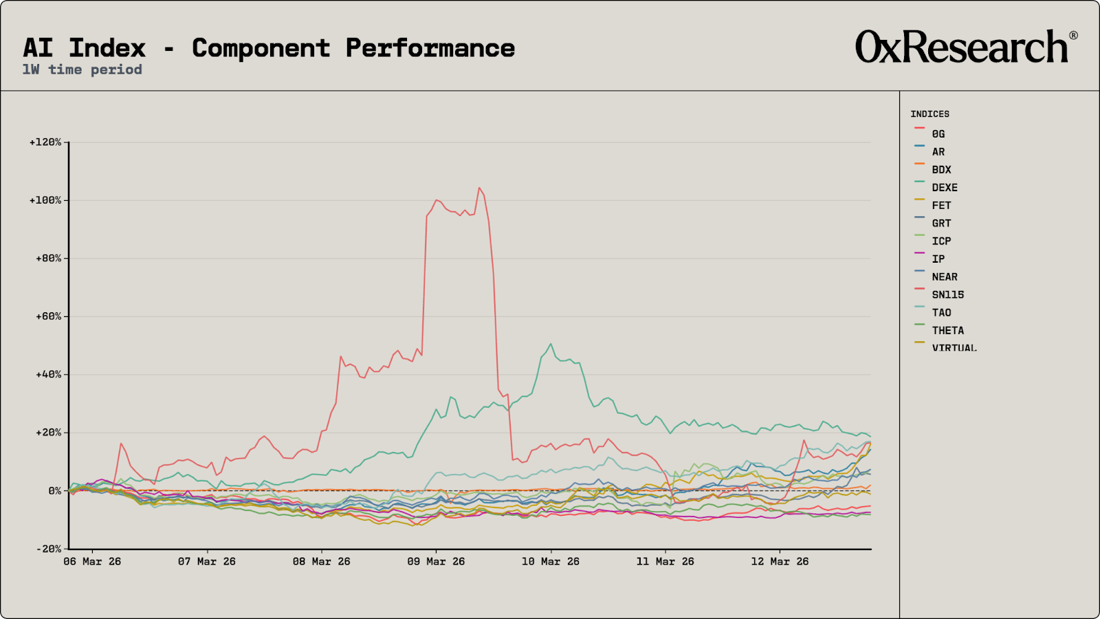 The weekly view confirms the trend. AI was up +16.8%, second only to Perps (+21.6%). The AI bid traces back to March 10 and Nvidia’s announcement of NemoClaw, an open-source platform for deploying autonomous AI agents that the company plans to debut at GTC (Nvidia’s GPU Technology Conference) next week. Coinbase’s Brian Armstrong and CZ both argued this week that AI agents need to transact via crypto, as banks cannot serve them — reinforcing the narrative that AI agents will need crypto rails for payments.