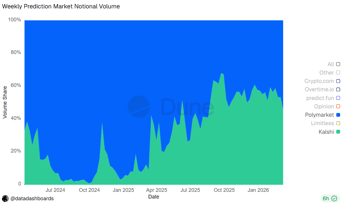If the pattern we have seen so far in 2026 continues, geopolitics could become one of the dominant themes in prediction markets: Platforms that allow traders to place directional bets or hedge geopolitical exposure stand to benefit. This shift is already visible in market-share data, with Polymarket clawing back ground from Kalshi and increasing its share from about 40% to 55% of total volumes since early February.