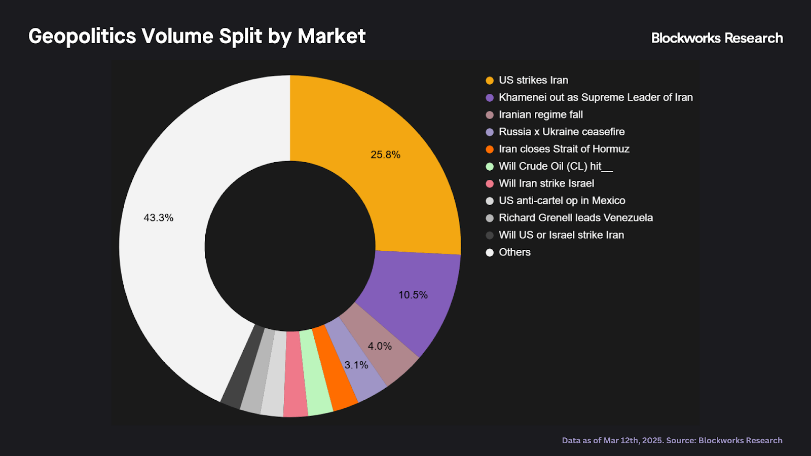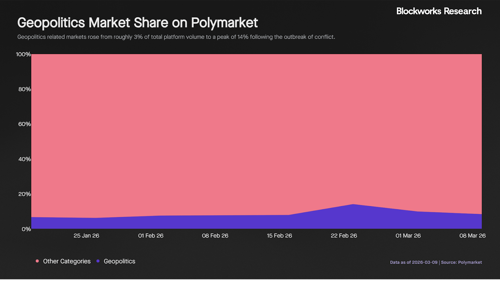 One thing that stands out is how quickly the platform launches relevant markets that gain immediate traction. Geopolitics-related markets have surged in activity since the conflict began, rising from about 3% of total volume before the escalation to a peak of 14%.