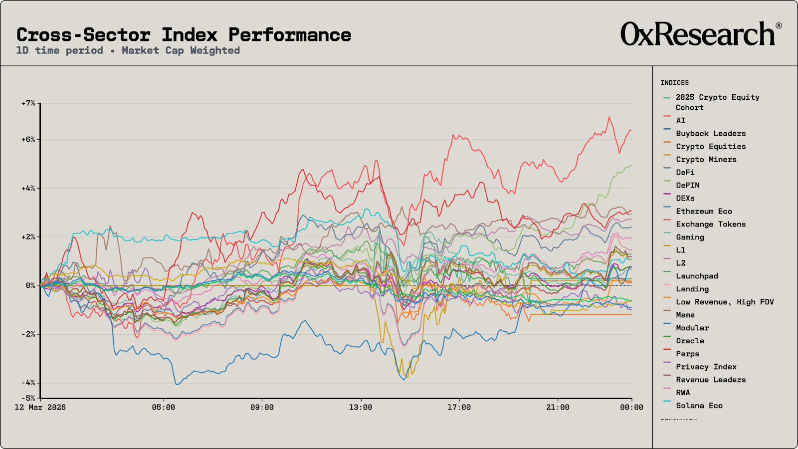 Today saw broad green across the board, with AI as the clear standout, even as the S&P 500 slipped 0.6%. Most sectors clustered in the 1% to 3% range, but AI pulled away decisively as the clear performer: AI was up +6.4%, DePIN +4.9%, Perps +3.1%, and DeFi +2.4%. Crypto equities bucked the trend in the wrong direction, down −1.2%.