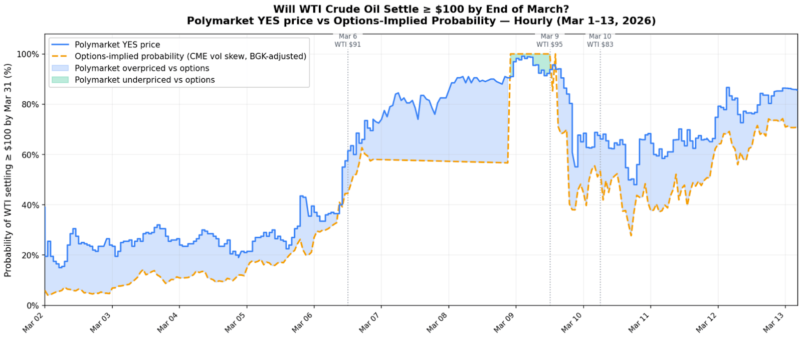 With geopolitical tensions pushing WTI crude toward $100, we compared two markets pricing the same event: Polymarket’s “Will WTI settle ≥ $100 by end of March?” against the probability implied by CME crude oil options. To make the comparison fair, we converted raw option prices into an equivalent touch probability using the same barrier structure Polymarket uses.