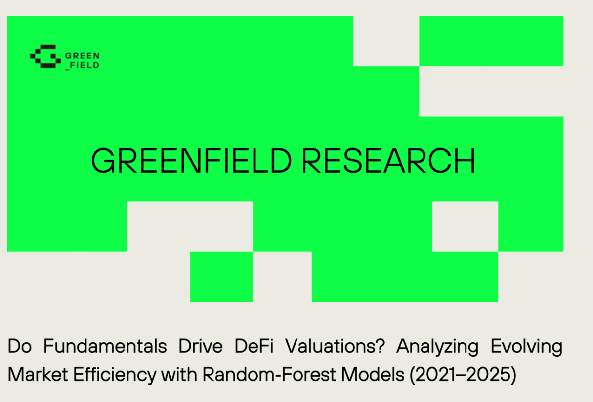 Greenfield Research finds that DeFi valuations are increasingly shaped by fundamentals rather than hype. Using multi-year data and machine-learning models, it shows that metrics like TVL, protocol fees and protocol revenue now explain the largest share of six-month returns, while social sentiment signals such as Twitter followers add little to no explanatory power. Fundamentals add almost no signal over one month but become decisive over six months, where fundamentals-only models have outperformed market-only models by more than 8% since early 2024. This shift reflects a maturing market that rewards real onchain cash flow and sticky usage. The lag between fundamentals improving and valuat catching up creates inefficiencies that disciplined investors can still exploit.