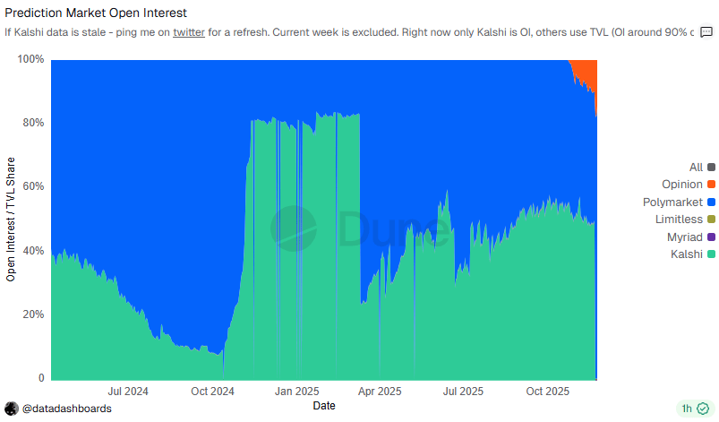 However, most of this growth appears to be farming-driven. Opinion Labs is running a points program, and the data quickly shows it. One market alone, titled Will Satoshi move any Bitcoin in 2025, has done $1.28 billion in volume, which accounts for 32% of its total notional volume. It is not the type of market one would expect to generate that level of activity organically. Despite the volume surge, Opinion Labs only represents 14% of total open interest, another sign of inorganic participation.