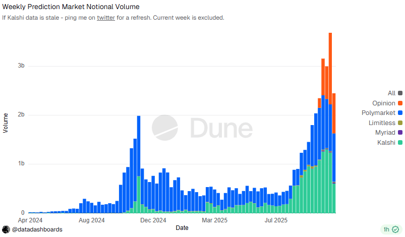 On the activity side, weekly volumes have broken past previous all-time highs, hitting $3.68 billion two weeks ago, which is 2.4x above last year’s election peak. A major reason for this surge is a new entrant called Opinion Labs. Backed by investors like YZi Labs, the platform is already doing close to one third of total volumes across prediction markets.