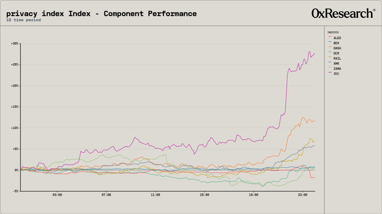 Within the Privacy Index, ZEC and DASH were the clear drivers of the sector’s +13.2% gain. ZEC was the standout, trading relatively flat for most of the session before spiking aggressively from ~+7% to nearly +28%, a near-vertical move that points directly to the ceasefire announcement as the catalyst. DASH, RAIL and XMR followed a similar but more-measured path as the rest of the index largely flatlined.