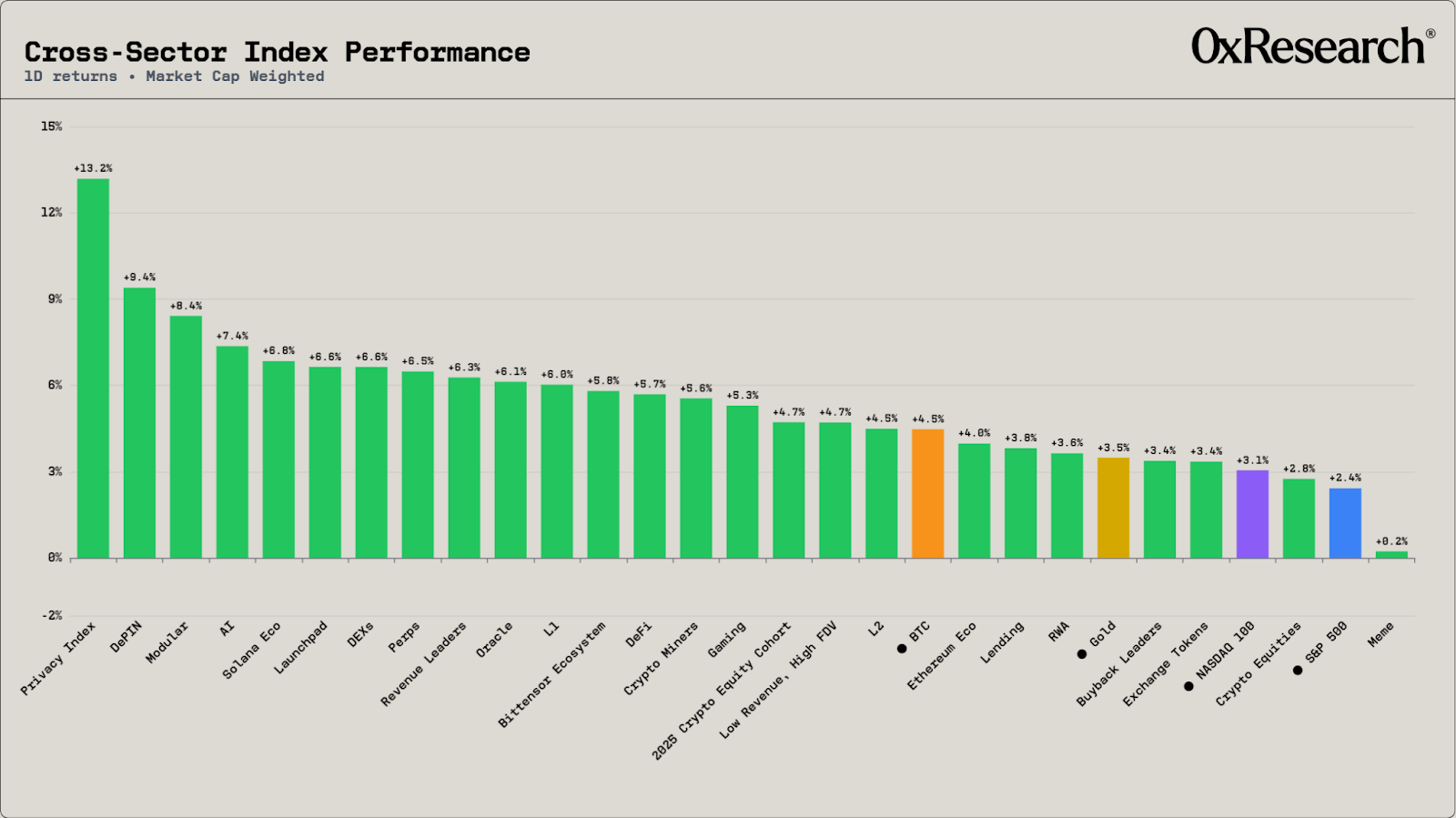Over the last 24 hours, the broader crypto market staged a strong rally across virtually every sector, with the Privacy Index leading the charge at +13.2%, followed by DePIN (+9.4%). Gold (+3.5%) also gained but lagged BTC (4.5%).