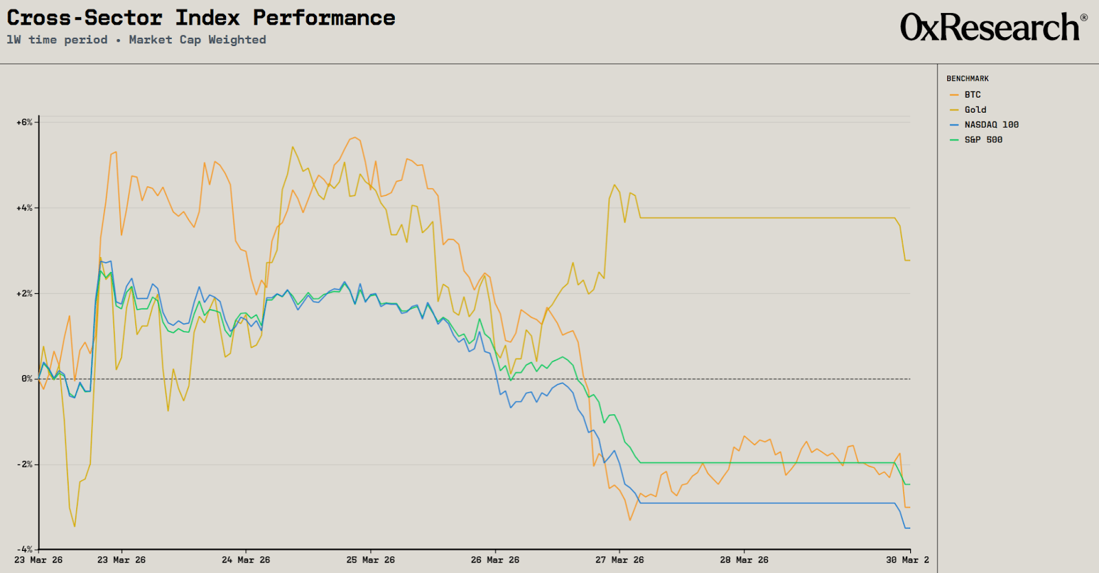Gold ended the week in the green, posting gains of 2.8% after five consecutive weeks of drawdowns, while the rest of the market continues to struggle. The S&P 500, BTC and Nasdaq all closed lower, down −2.5%, −3.0% and −3.5%, respectively.