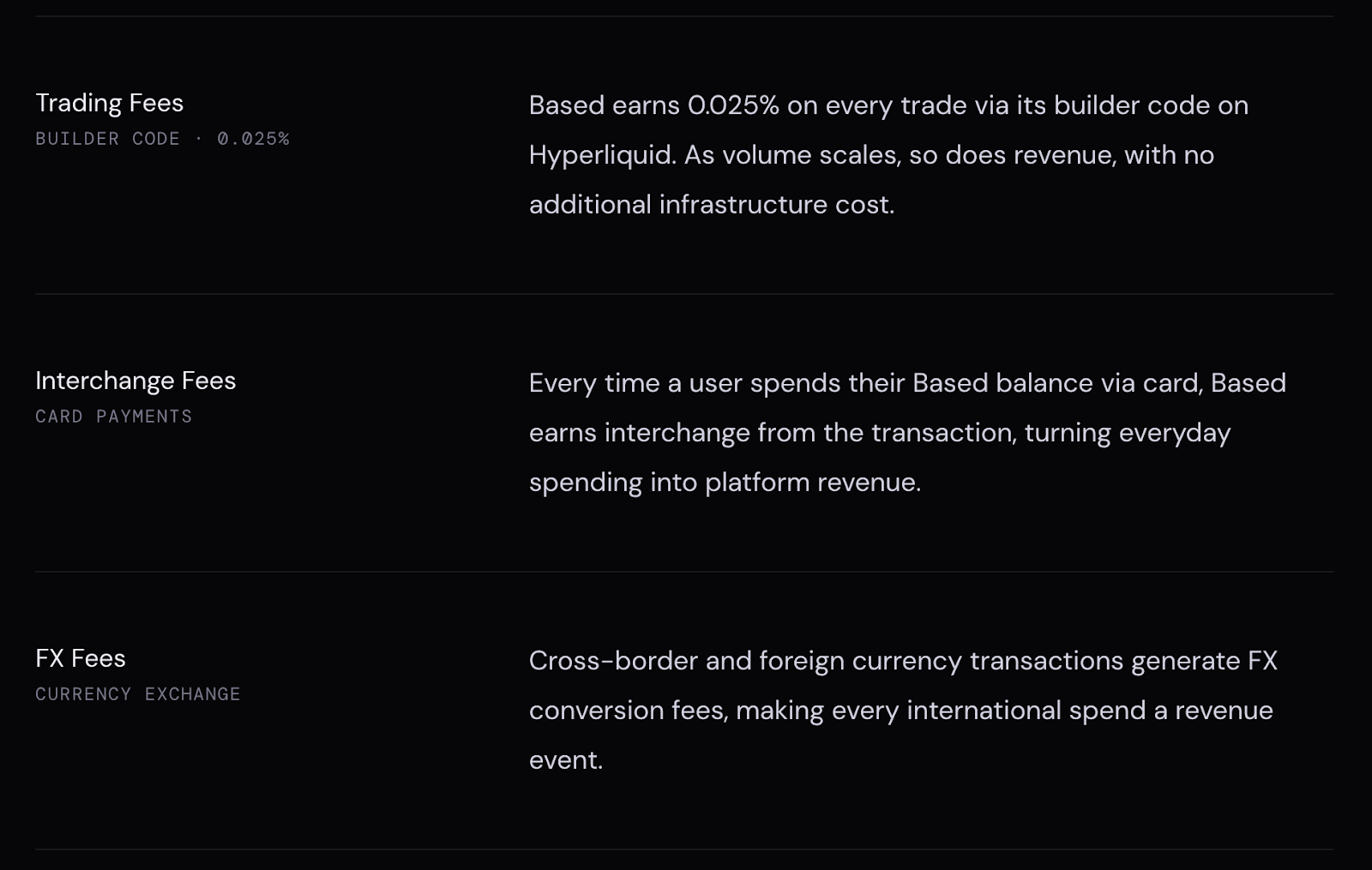 Based is the highest-volume builder-code exchange on Hyperliquid, with $41B in cumulative volume, $15M in revenue, and roughly 2% of total Hyperliquid flow on a trailing basis (peaks above 10%). It sits second behind Phantom on users and all-time builder-code revenue. The product surface is broader than most builder-code frontends: perps, spot, Polymarket integration, fiat on/off ramps, and a Visa spend card. That makes it more of a consumer-distribution layer for Hyperliquid than a pure trading interface.