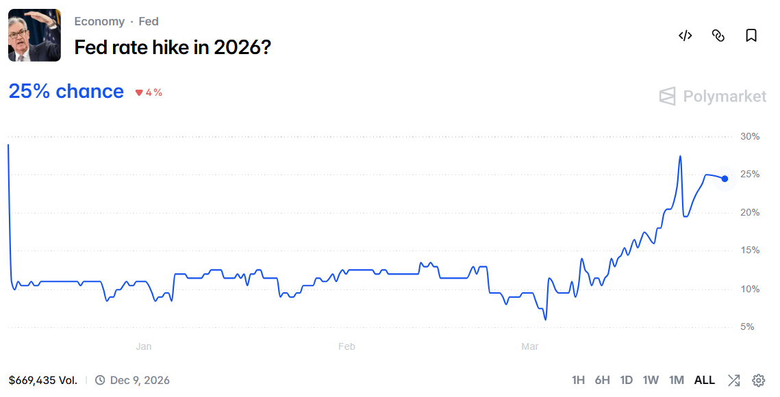 This shift in macro expectations is also showing up in rate markets, with a 24% probability now being assigned to a Fed rate hike in 2026. Higher-for-longer expectations continue to weigh on risk assets across the board.