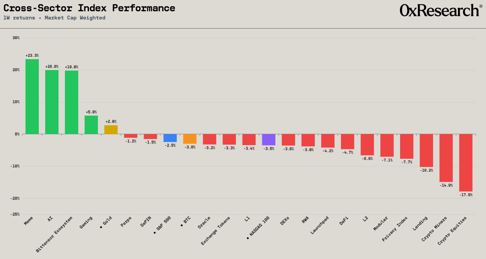 In AI, TAO remains the clear leader, up 20.3% on the week. The broader Bittensor ecosystem has followed closely, up 19.8%. The drivers behind this move were covered in a recent edition, and momentum continues to build. Outside of these names, FET was also a strong performer, rising 11.5% on the week.