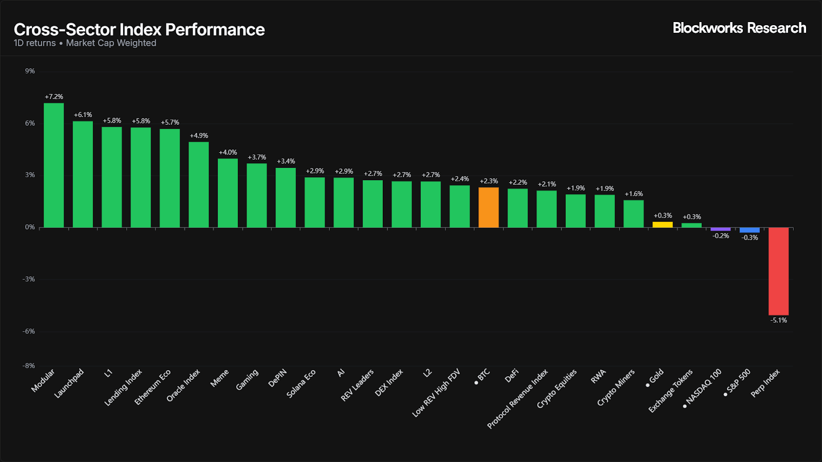 Markets leaned risk-on, with crypto leading and traditional assets mixed. BTC posted a modest gain (+2.3%), outperforming equities where the S&P 500 (-0.3%) and Nasdaq 100 (-0.2%) softened, while Gold held nearly flat (+0.3%). The standout laggard was the Perp Index, which contracted by -5.1%.
