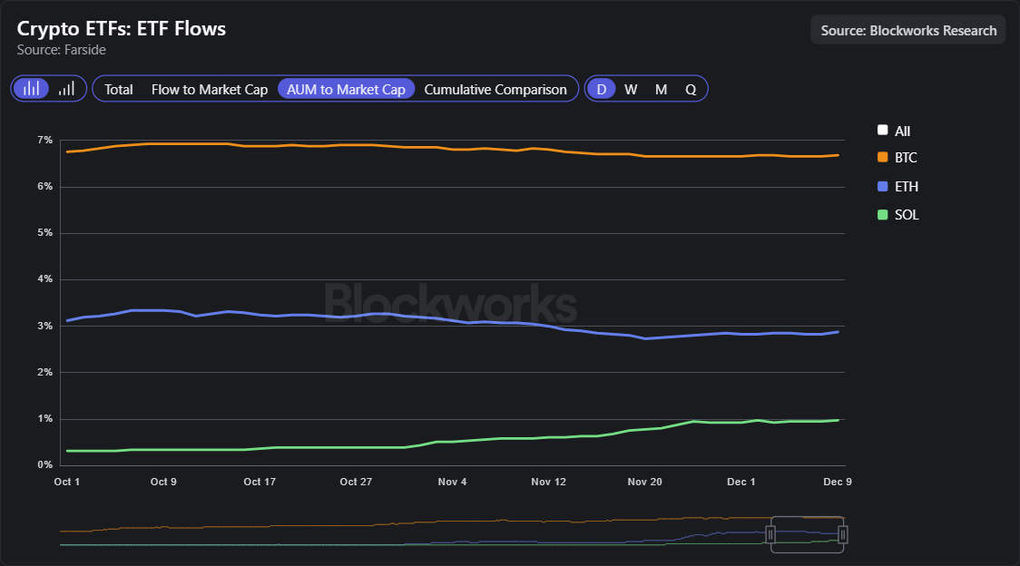 Still, AUM-to-market-cap ratios tell a different story. BTC remains stuck near ~6.6–6.8%, ETH continues its multi-month slide from ~3.3% to ~2.8%, and SOL, while rising, sits just under 1%. This divergence implies that price appreciation, not sticky inflows, has been the dominant force maintaining ETF sizes.