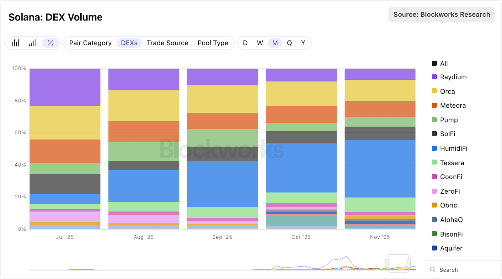 As of this morning, HumidiFi sits at 323M FDV, a 5-6x for participants who bought in during the ICO, and a 2x since TGE yesterday. We’ve written extensively about Prop AMMs already, and how different Solana’s trading landscape looks due to their proliferation, both in the newsletter and through our research. For some quick context, HumidiFi has commanded more than 25% of Solana DEX volume since September, with other Prop AMMs (Tessera etc.) also taking meaningful portions.