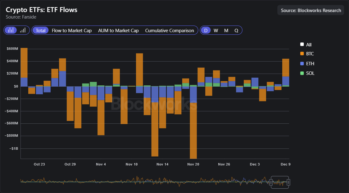 Flows finally turned meaningfully positive. BTC ETFs drove the bulk of the move ($287M), ETH had its best day since Oct. 28 ($142M) and SOL contributed marginally ($16M). This is the first clean signal of risk appetite returning after nearly a month of choppy to negative prints. The flow spike likely reflects short-term positioning ahead of catalysts such as FOMC, inflation data and jobs. It can also be attributed to quarter-end optics, as allocators often re-express benchmark exposure into liquid wrappers during macro-heavy weeks.