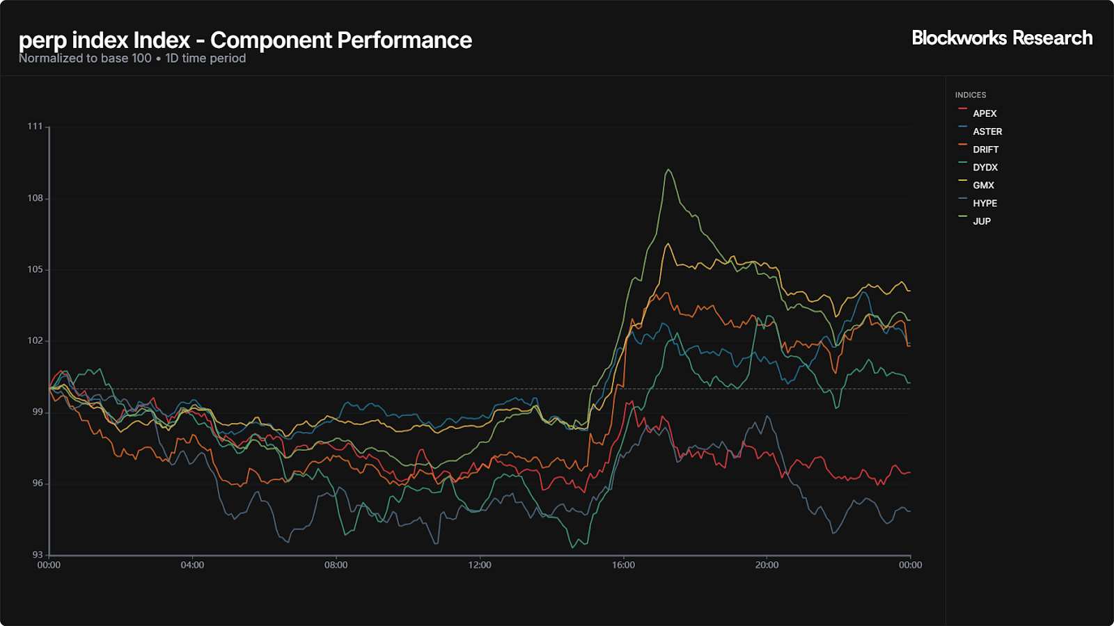 Perps (-5.1%) were the day’s clear laggard, weighed down by a sharp intraday spike-and-fade across dYdX, GMX, and specifically HYPE. A midday squeeze briefly lifted the sector before momentum stalled and flows reversed into the close. JUP rose as much as 9% before retracing most of its gains. Meanwhile, HYPE has been struggling as of late, as builder codes create new frontend relationships with users, and the market anticipates a TGE from rival Lighter.