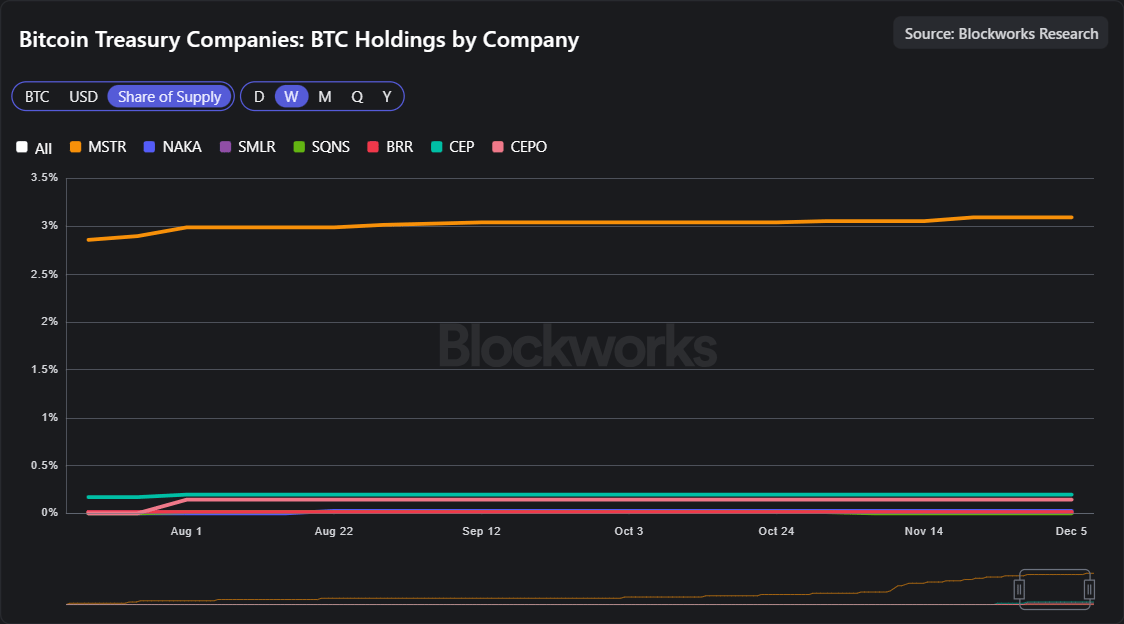 ETF flows are becoming increasingly important for BTC because traditional “DATCO” buyers aren’t carrying the bid anymore. The latest treasury holdings data shows that, aside from Strategy (MSTR), corporate accumulation has been effectively flat for months. Names like NAKAMOTO, SMLR, SQNS, and the smaller treasury cohorts have added marginal amounts at best, contributing almost nothing to incremental demand. Even MSTR can’t continue to accumulate in the same way it did before.