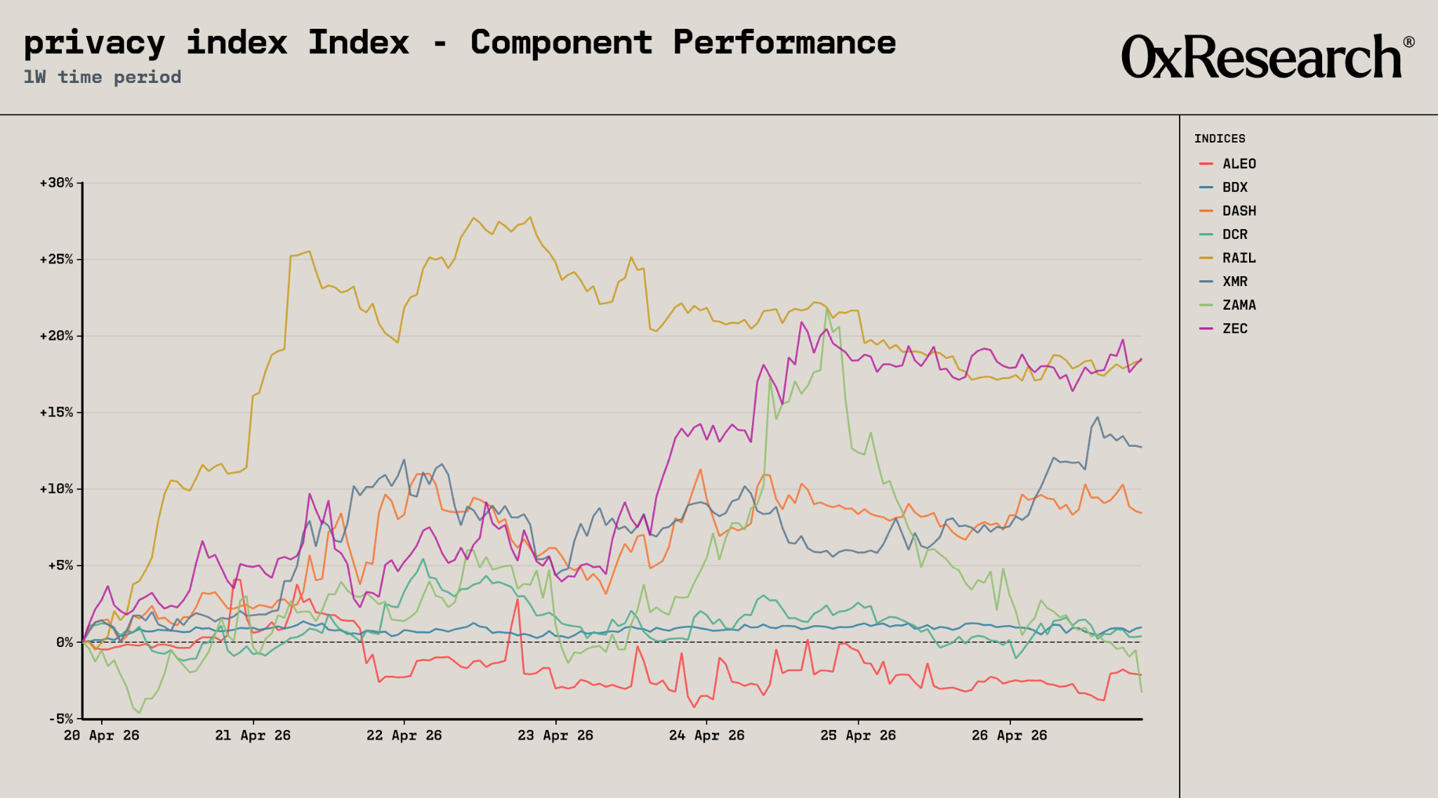 Inside the privacy index, ZEC and RAIL led the pack at roughly 18%, with XMR and DASH posting double-digit and high single-digit gains behind them. ZEC is typically a high-beta play to BTC moves, and BTC's 6.1% week amplified through the name, coupled with a Robinhood listing on April 24. RAIL rode the broader privacy bid without a specific catalyst, as sentiment lifted after Ethereum’s draft EIP-8182 was discussed, putting protocol-level privacy back in focus across the category.