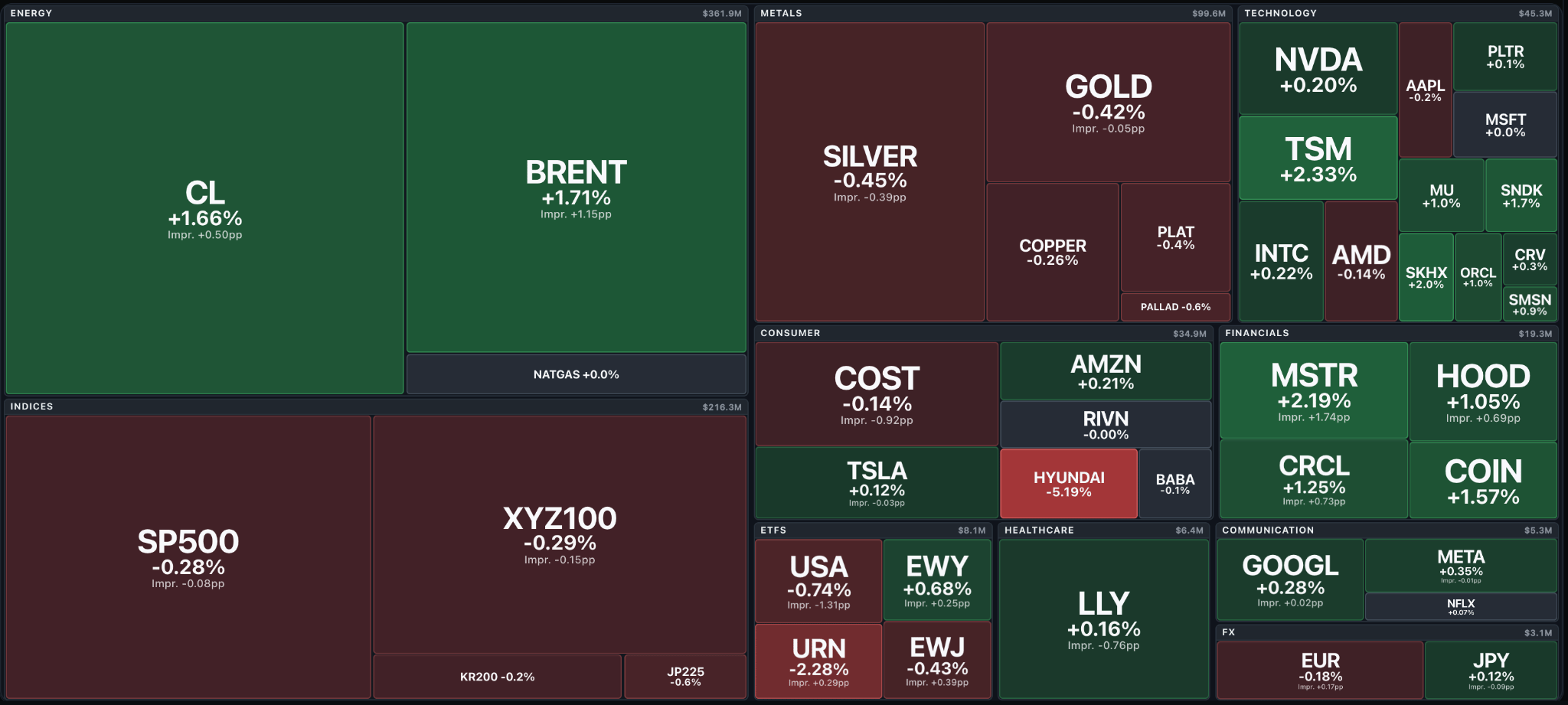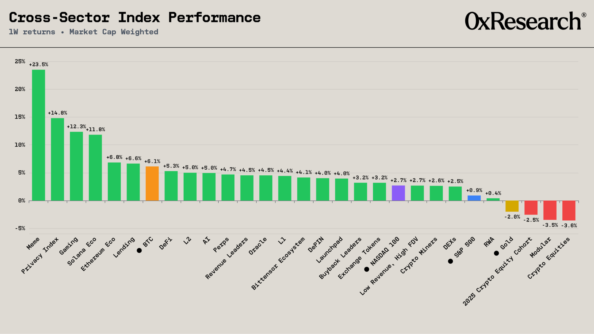 The last week was broadly green across crypto, with privacy and memes as the standout sectors. Memes led at 23.5% and the Privacy index put up 14.8%, with Gaming and Solana Eco clustered behind in the low double digits. BTC tracked the rally at 6.1% while TradFi grinded higher, with the NASDAQ up 2.7% and the S&P 500 up 0.9%. Crypto equities and modular were the sectors meaningfully down on the week.