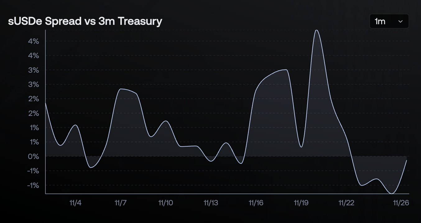 The driver behind this is unattractive carry. Following October's OI wipeout, funding rates for BTC and ETH are muted to negative, with Ethena’s dashboard showing negative funding across majors. Since November, the sUSDe spread has been below three-month Treasury yields.