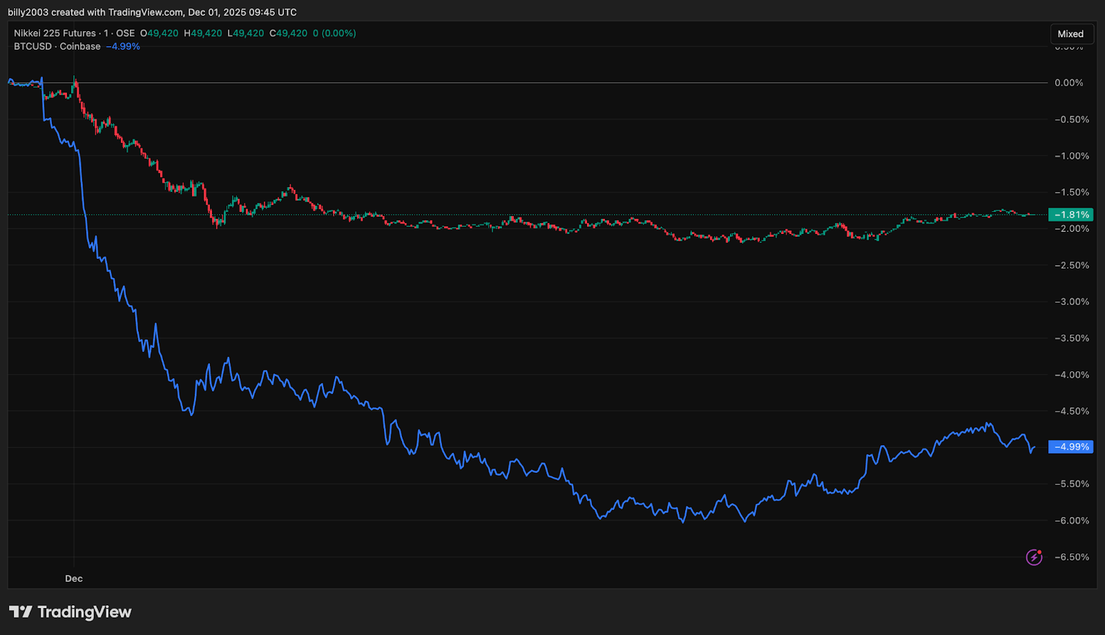 The last surprise move in mid-2024, when the BOJ lifted rates to 0.25%, drove a sharp USDJPY reversal and contributed to a near 30% BTC drawdown to roughly 49K as macro books de-grossed risk. A similar pattern appeared today, with BTC tracking the Nikkei lower during Asia hours.