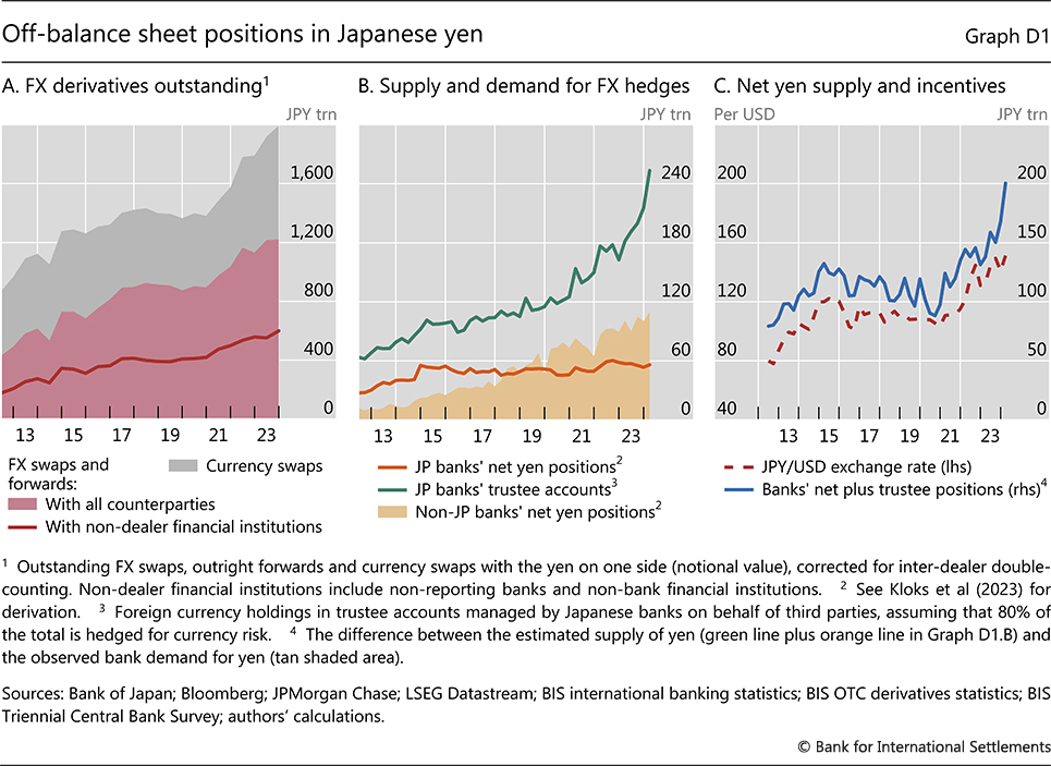 Notional FX swaps and forwards with JPY on one side reached $14.2 trillion dollars (about 1,994 trillion yen). These positions sit off balance sheet and do not appear in conventional debt metrics.