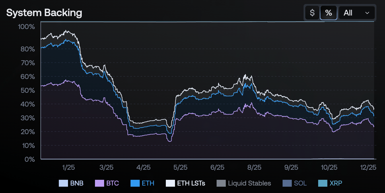 With core delta-neutral strategy being unprofitable or returning low yields, 63.3% of the system is now held in liquid stables rather than deployed in delta neutral carry.