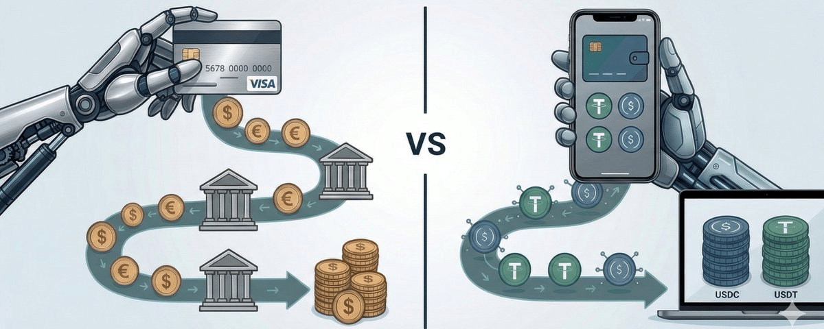 But card fees and settlement structures make micropayments, high-frequency API calls, and other machine-native transactions uneconomical. Stablecoins solve this by enabling near-instant, low-cost payments with programmable wallets and emerging protocols for agent identity and micropayments. The likely future is hybrid: cards for human-style commerce, stablecoins for machine-native transactions.
