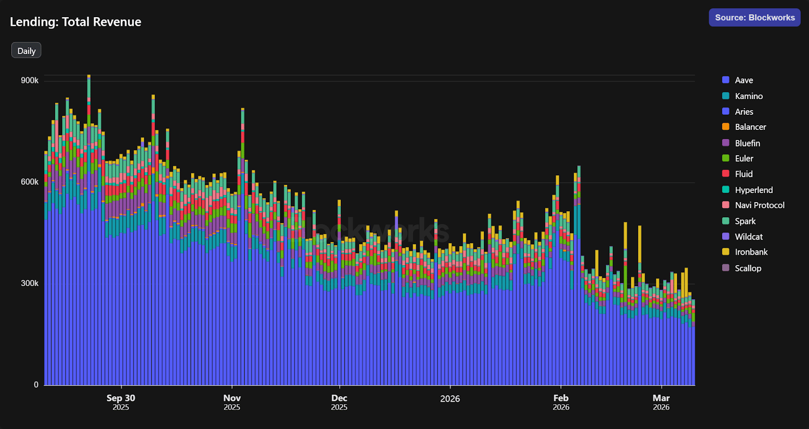 Lending protocols’ recent outperformance comes despite the sector’s broader downward revenue trend. Daily revenue for onchain lenders peaked at ~$850K in September 2025 and has since fallen to roughly $250K per day (−70%).