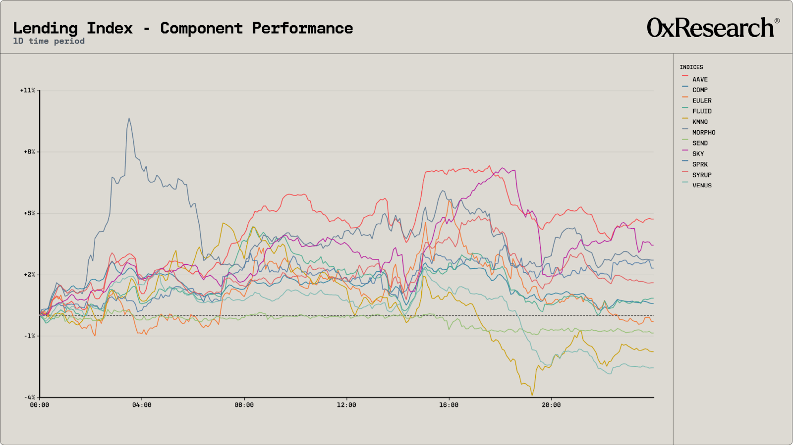 As for the lending sector, performance was broadly positive as the largest platforms — Aave (4.7%), SKY (3.4%) and Morpho (2.7%) — led the returns profile among their peers.
