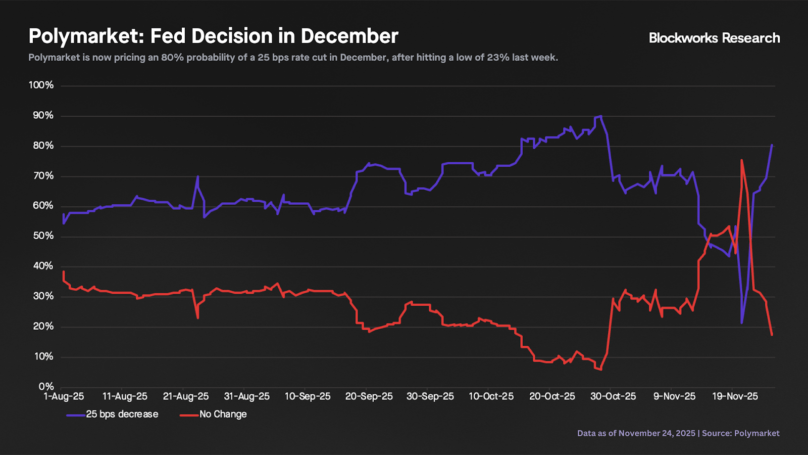 Hi all, happy Tuesday! Markets bounced as December rate cut odds swung back above 80%, lifting BTC, equities and gold.