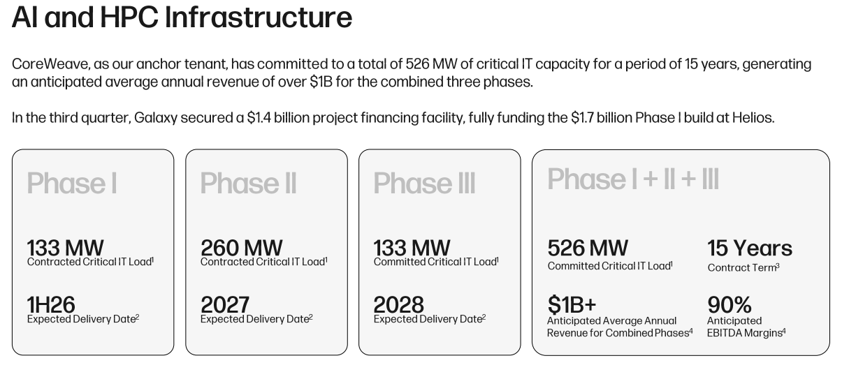 Galaxy has three key segments. About 40% of equity capital sits in Digital Assets, which encompasses Global Markets and Asset Management & Infrastructure Solutions. Global Markets drives most of the earnings here, with its sell-side trading desk (spot and derivative OTC, lending, structured products), coupled with the investment banking arm adding M&A advisory and equity and debt capital markets fees. Asset Management and Infrastructure Solutions earns fee income from active and passive investment products, crypto services, and staking and custody solutions that offer clients customized exposure and stronger security. 35% of equity capital sits in Treasury and Corporate, which manages Galaxy’s own portfolio of digital assets and strategic equity stakes, so Q3’s profit reflects mark to market gains of those holdings. The remaining 25% is tied to Data Centers, mainly the Helios build in Texas, which is effectively pre-revenue today but is expected to generate contracted rent from 2026 with CoreWeave its anchor tenant. Phase I targets delivery of 133 MW of contracted critical IT load by 1H26, with capacity rising to 526 MW when Phase III is completed in 2028.
