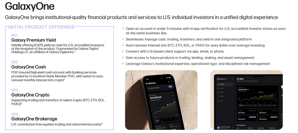 GalaxyOne is Galaxy’s consumer platform for US individual investors, bundling high yield cash, premium yield notes and simple crypto and US equity trading in one app. If it scales, it can grow fee and spread income on client balances, provide cheaper and stickier funding for the trading and lending book, and create a direct funnel into Galaxy asset management and staking products. In big picture terms, it is a way for Galaxy to capture more of the economics of retail flows instead of relying only on institutional clients.