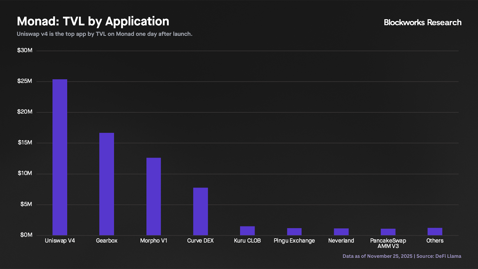 While Monad’s architecture may be novel, the fact that it took so long to come to market means it now faces an uphill battle catching up to more mature networks like Solana or even L2s like Base in terms of ecosystem activity, DEX volumes, TVL, stablecoins in circulation and so on. The chart below shows the top applications on Monad by TVL, as of today. The four largest apps are well established players in the EVM ecosystem, with Uniswap v4 topping the cohort with $25 million in TVL.