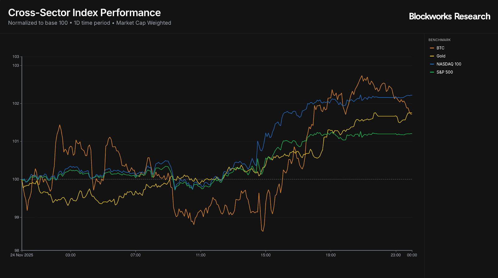 Markets bounced on Monday as odds swung back toward a potential December rate cut. Bitcoin climbed as much as 2.73%, briefly pushing above $89K before closing the day at $88.2K (+1.72%). The standout performer, however, was the Nasdaq 100 (+2.22%), posting its strongest daily gain since mid-May. The S&P 500 (+1.20%) also logged its best session in six weeks, while Gold (+1.75%) edged out BTC on the day, closing at its highest level since Nov. 14.