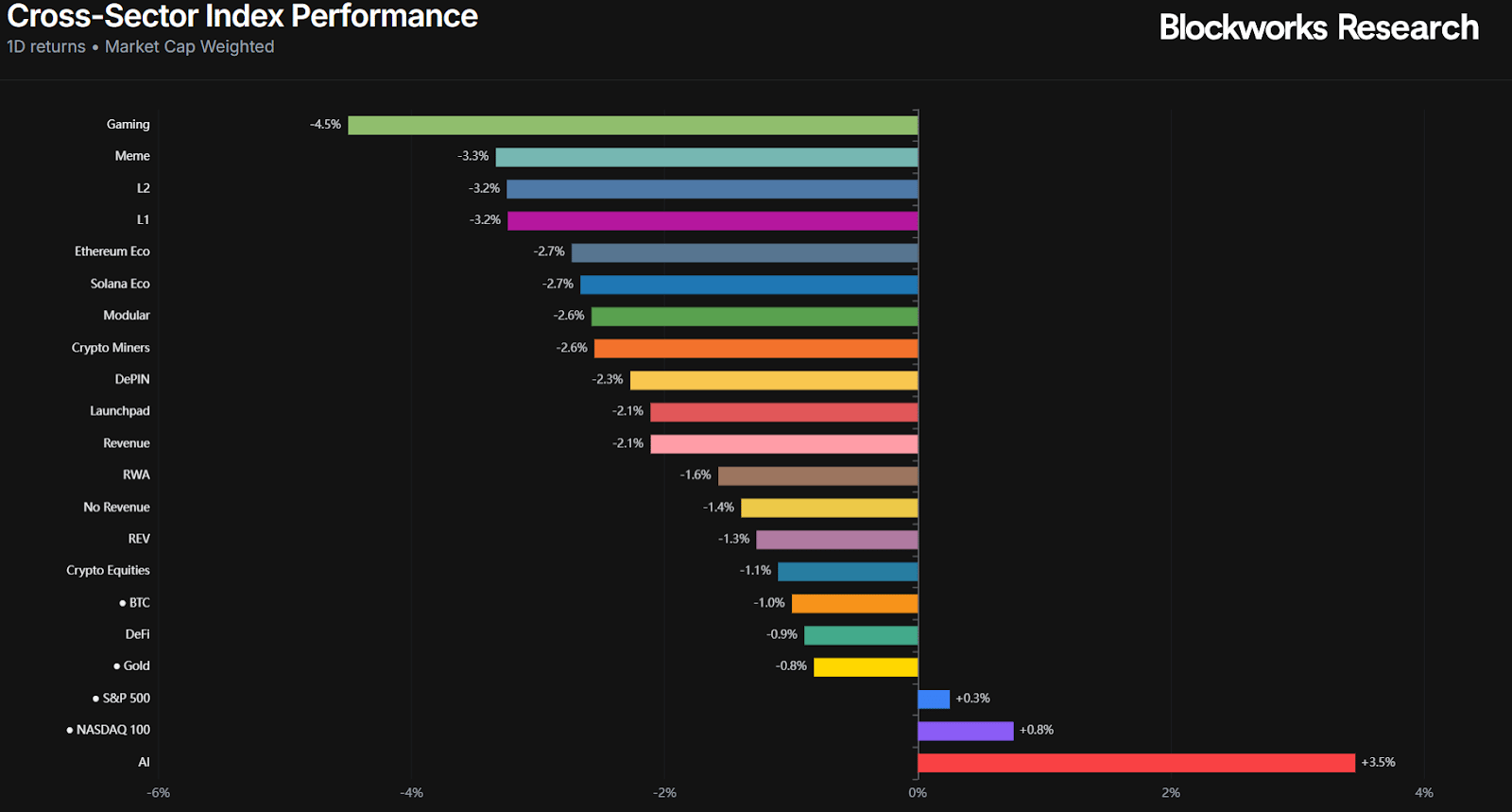 Crypto sectors painted a sea of red. Gaming (-4.5%) led declines, followed by Meme (-3.3%), L2 (-3.2%), and L1 (-3.2%), a notable reversal in higher-beta categories that had outperformed earlier in the month. Ethereum and Solana ecosystems (both -2.7%) also lagged, as network activity slowed and profit-taking intensified post-recent rallies. The one bright spot was AI (+3.5%), which bucked the trend amid renewed enthusiasm for decentralized compute narratives and broader tech strength.