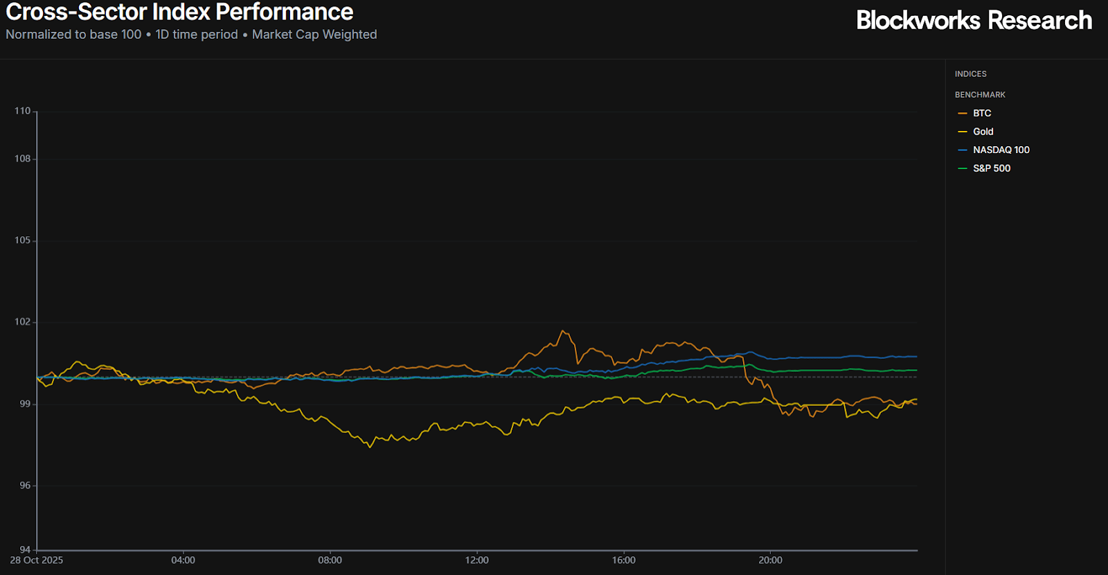 Global markets diverged sharply as traditional risk assets held firm while crypto sectors saw a broad selloff. The Nasdaq 100 (+0.8%) and S&P 500 (+0.3%) extended their recent resilience, supported by strong tech earnings and cooling Treasury yields. Gold (-0.8%) and BTC (-1.0%) both slipped, signaling modest risk rotation rather than outright fear or a mild “risk-off” tilt within digital assets, even as equities stayed buoyant.