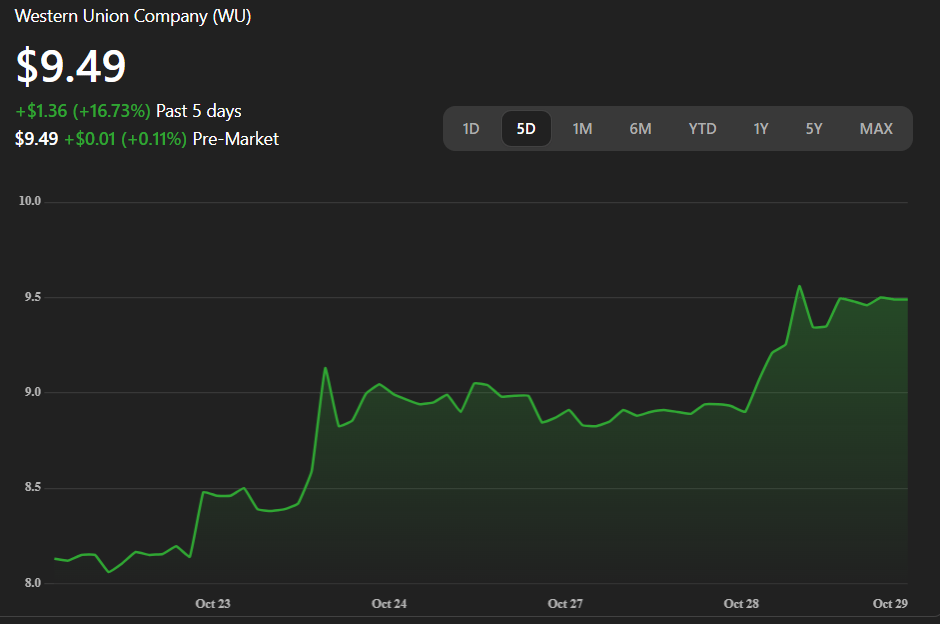 The strategy aligns with what’s already happening onchain: USDT and USDC volumes through emerging market exchanges have doubled YTD, while USDC remittance corridors (like Philippines and Brazil) are seeing faster settlement speeds and lower costs than traditional wires. Western Union’s “digital-first” expansion into Latin America, via Argentina and Brazil wallets, makes stablecoin integration a natural next step. This news pushed the stock higher, and WU is up (+16.7%) since.