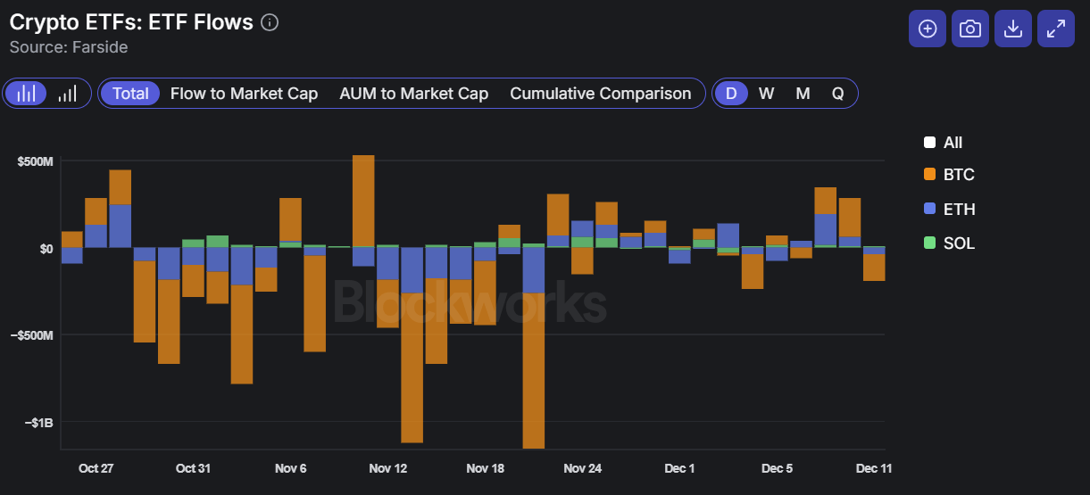 Flows remain a headwind. After a strong $346.2M day of ETF inflows on Dec. 9, momentum faded again with both BTC and ETH ETFs seeing outflows of -$154.2M and -$42.3M, respectively, yesterday. The lone bright spot continues to be SOL ETFs, which are still attracting low single- to low double-digit millions in daily inflows.
