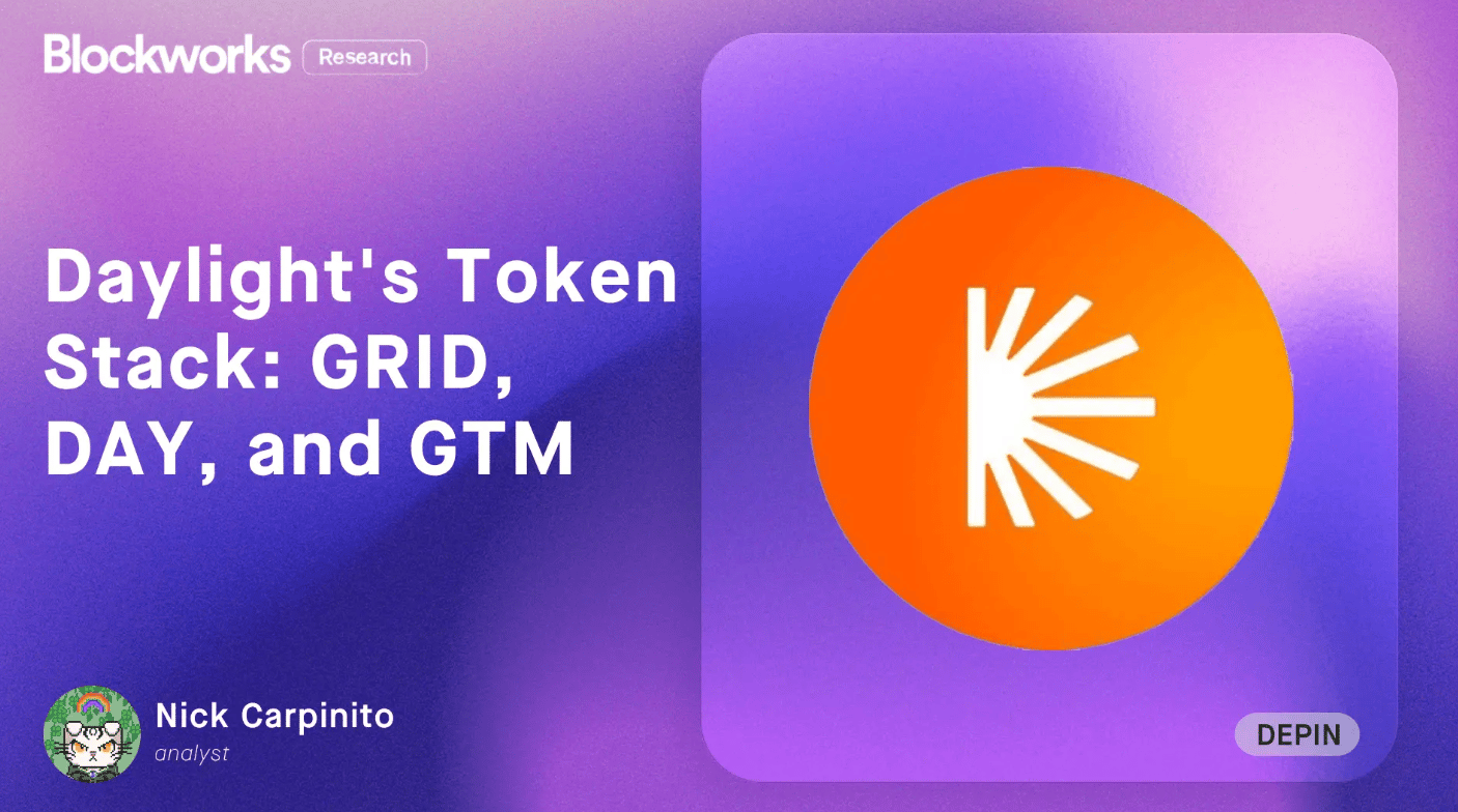 Blockworks Research finds that Daylight Energy built real marketplace revenue and operating scale before adding a protocol layer, prioritizing utility over token speculation. Its system uses GRID as a stable settlement asset backed by energy capacity commitments and sGRID to pass through cash flows from residential solar and battery assets. Homeowners interact through simple subscriptions, while onchain verification handles dispatch and payments in the background. Daylight already operates across multiple US states with installed solar and batteries generating PPA and grid service revenue, positioning the protocol to aggregate distributed energy at scale while meeting the reliability needs of traditional power markets. Read more