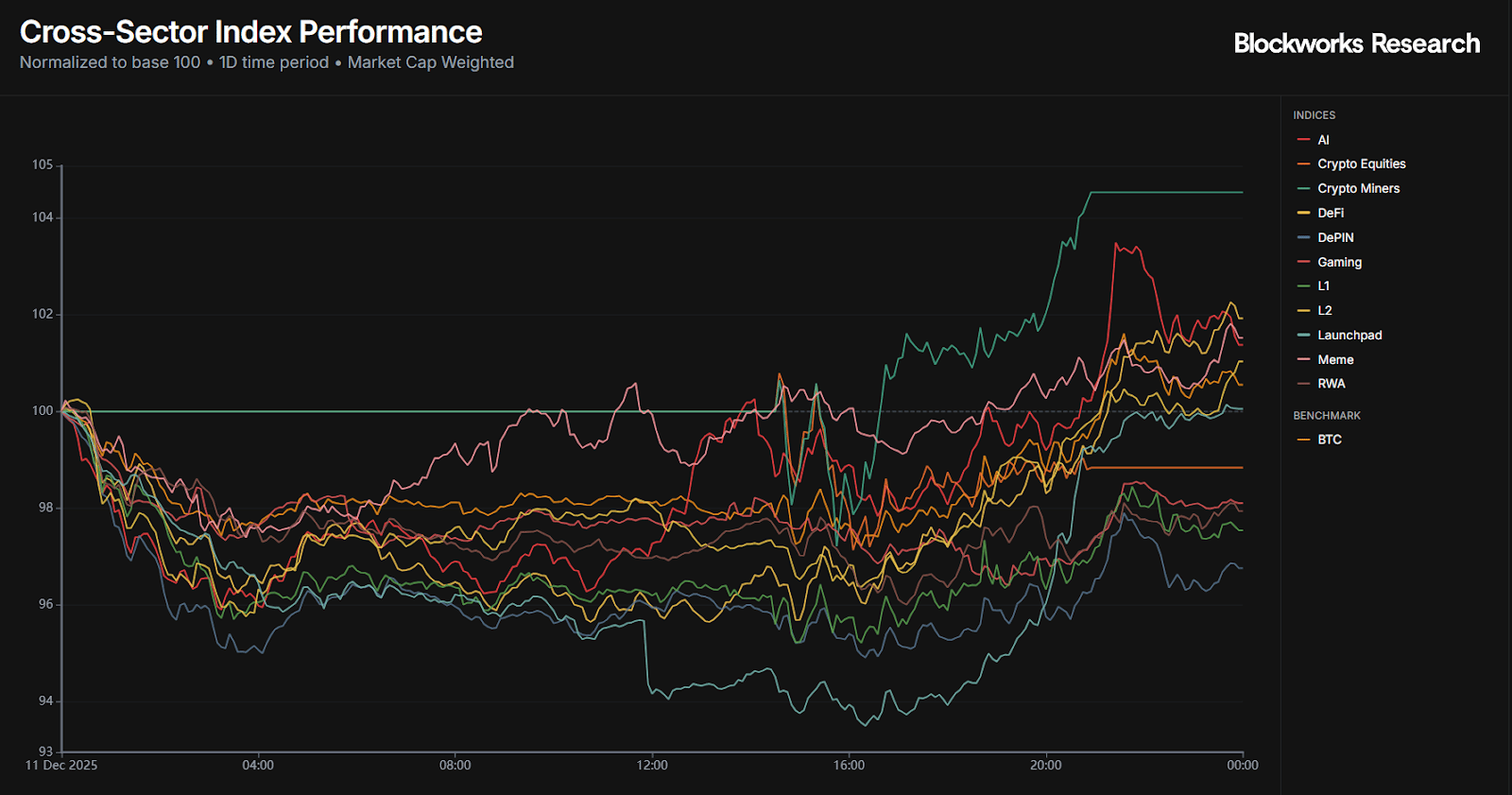 Crypto sector performance echoed the uneven tape. Despite renewed skepticism around AI, Crypto Miners were the standout performers, rising 4.5% on the day. IREN, which makes up 24% of the index, gained 4.4% and helped lead the move. DeFi followed with a 1.93% gain, driven by strength in AAVE, ENA, and HYPE, which together account for 44% of the index and all closed higher.