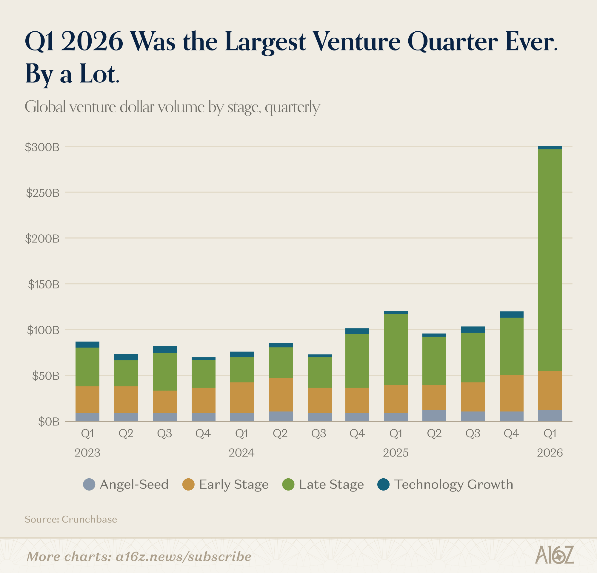 This disconnect likely reflects speculative retail demand. As a16z recently noted, Q1 2026 was the largest quarter for venture investment on record, with roughly $300B deployed across around 6,000 startups, up more than 150% both QoQ and YoY. OpenAI, Anthropic, xAI and Waymo alone accounted for about $188B, or roughly 65% of that total. As some of the world’s most valuable companies remain private for longer, retail investors are increasingly looking for ways to gain exposure.