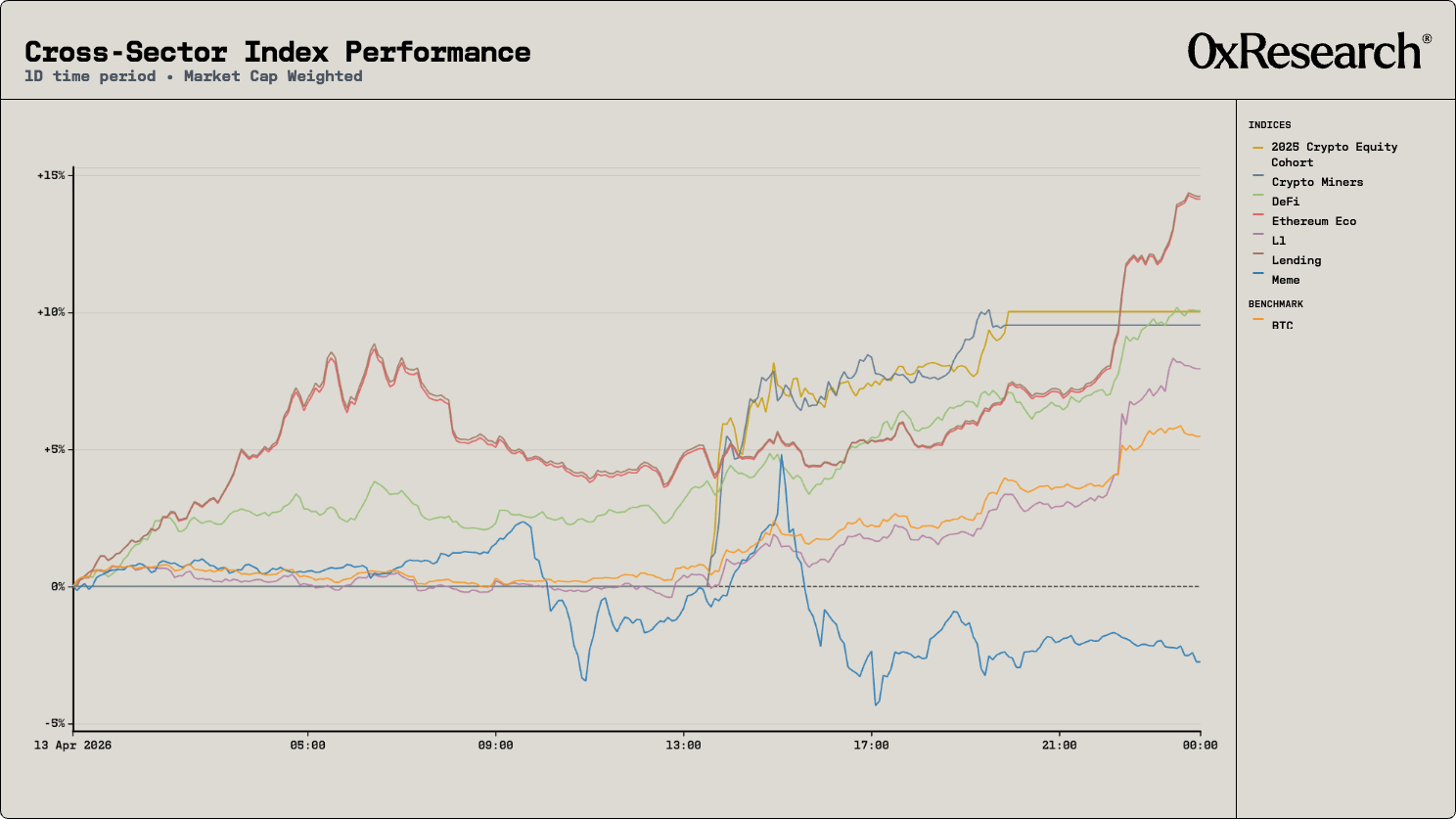 That mix matters because yesterday’s 0x issue was built around oil, blockade risk, and miners as AI-infrastructure beta. Monday’s close did not reject that trade, but it clearly widened the field. Ethereum-linked beta, Lending, and DeFi all moved harder than Miners, which is a cleaner sign of crypto-native risk appetite over another single-sleeve squeeze.
