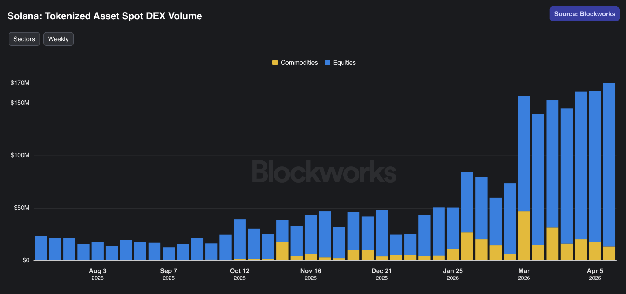 Last week, Solana recorded a new all-time high in weekly tokenized-asset spot DEX volume, reaching $169M. Notably, 92% of that volume came from equities, while the remaining 8% was driven by commodities, largely Tether Gold (XAUT). This marked the third consecutive week of record highs in tokenized-asset volume on Solana.