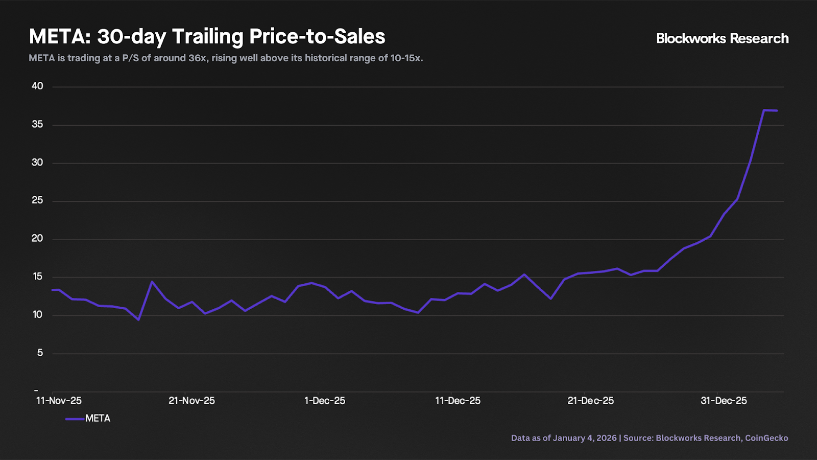 Despite declining daily revenue, META has performed remarkably well, rallying roughly 40% over the past week. As a result, META’s 30-day trailing P/S has increased to ~36x, well above its prior two-month range of ~10-15x.