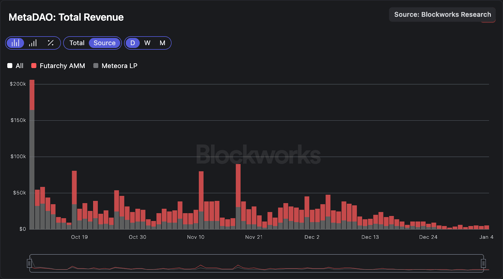 Since the Futarchy AMM went live on Oct. 10, 2025, MetaDAO has generated about $2.4M in revenue, with roughly 60% coming from the Futarchy AMM and 40% from its Meteora LP position.