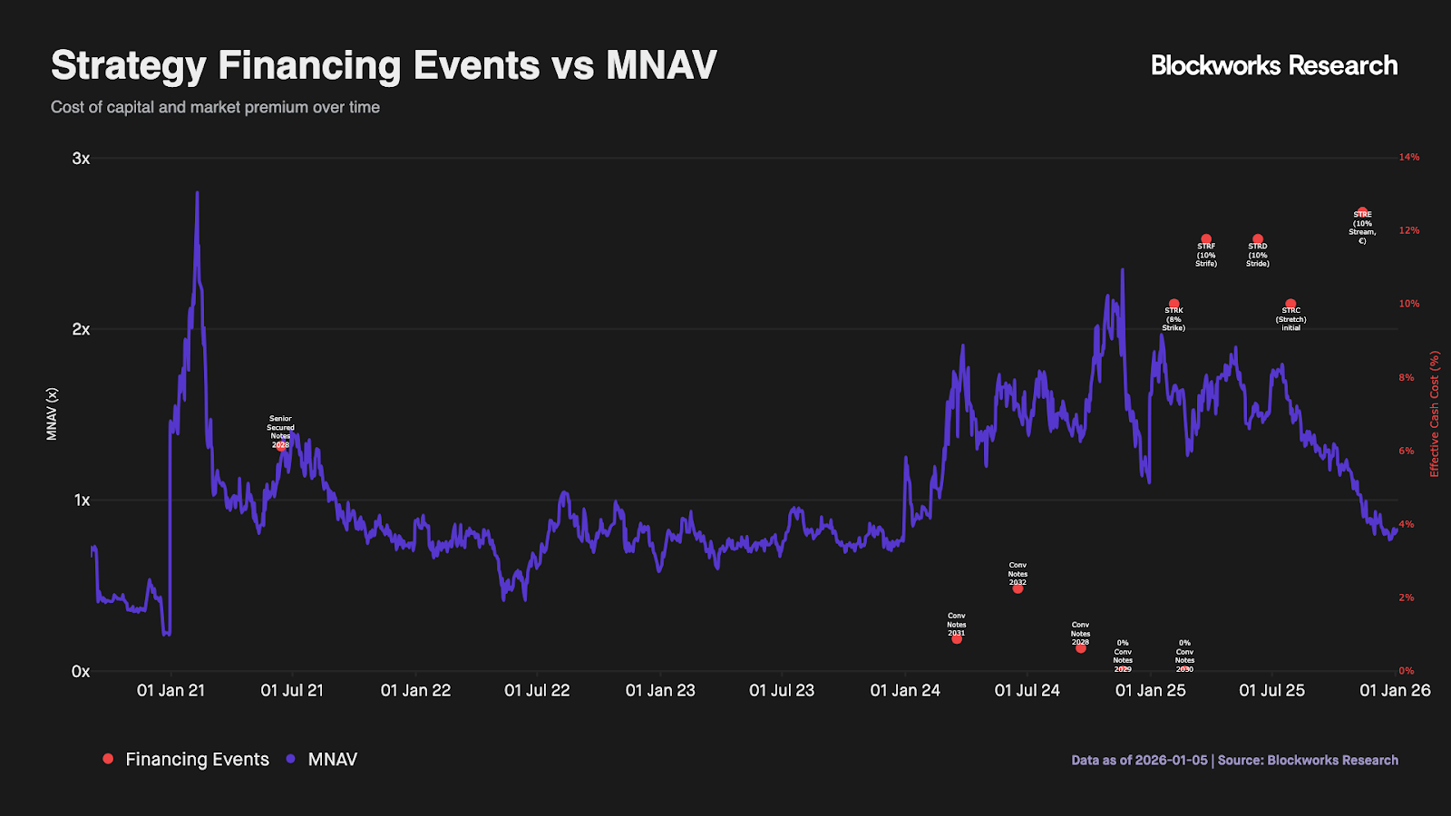 The setup for 2026 looks materially weaker. With mNAV compressed and financing shifting toward double-digit preferred costs plus dilutive ATM common issuance, Strategy's bid becomes harder to scale without worsening BTC-per-share dilution. Strategy is still a sentiment marker, but the buying pressure should be more muted and episodic, leaving ETF flows and broader crypto risk appetite as the more reliable price-setting forces.