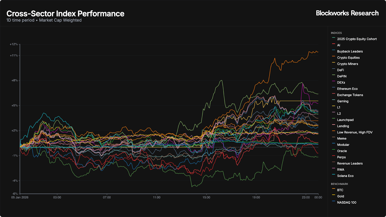 Broader beta was green across the complex, but leadership skewed decisively toward the frothier end of the spectrum. Low Revenue, High FDV led by a wide margin (+11.4%), followed by DePIN (+6.4%), Crypto Miners (+5.6%), and DEXs (+5.2%). BTC was up +2.6%, closer to the middle of the pack, while the more fundamental baskets like Revenue Leaders (+2.7%) lagged the high-beta bounce. The only real laggards on the day were Perps (-0.7%) and Launchpad (-1.2%).