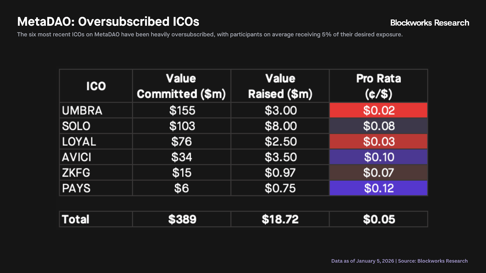 The last six MetaDAO ICOs have been heavily oversubscribed, with allocations settled pro rata. This allocation mechanism favors whales, who can afford to overcommit capital to secure a meaningful allocation. As the chart below shows, across the past six MetaDAO ICOs, participants have received an average of ~5% of their desired exposure.