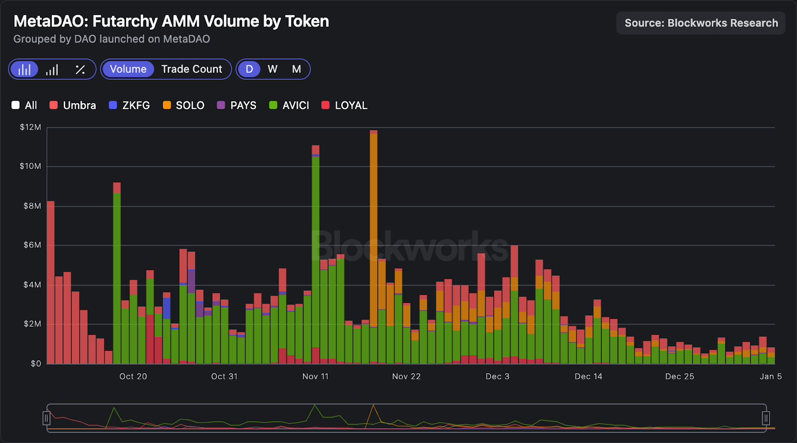 The chart below highlights why. Token volumes tend to be highest around TGE and the days immediately following, meaning sustained Futarchy AMM volumes, and by extension, revenues, are highly dependent on new launches coming through the pipeline.